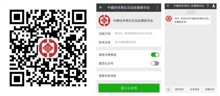 “中藏协体育纪念品收藏委员会”微信开通后除即时推送“动态预告”、“珍藏文史”等主题信息外,还将为博览会、展览等相关活动提供便捷的交流平台。